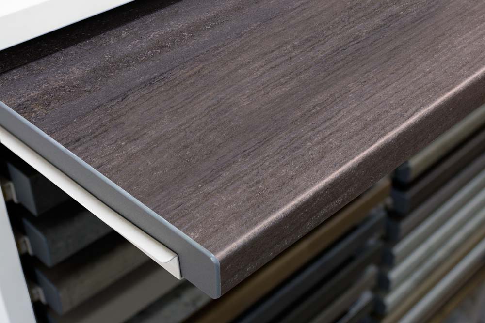 Постформинг или кромирование. Хорошо известно, что основная проблема ДСП — кромка. Если через стыки будет проникать вода, плита разбухнет и столешницу придется менять. По технологии постформинга края HPL-пластика заворачиваются за основу ДСП. Угол загиба может составлять 180°: то есть пластик с рабочей поверхности «перетекает» на торец и загибается под столешницу. Нижняя часть столешницы всегда оклеена влагостойким картоном или компенсационным пластиком. В месте стыка верхнего декоративного покрытия и нижнего защитного слоя наносится силиконовый каплесборник, препятствующий попаданию влаги во внутрь столешницы, что тем самым продлевает срок службы.